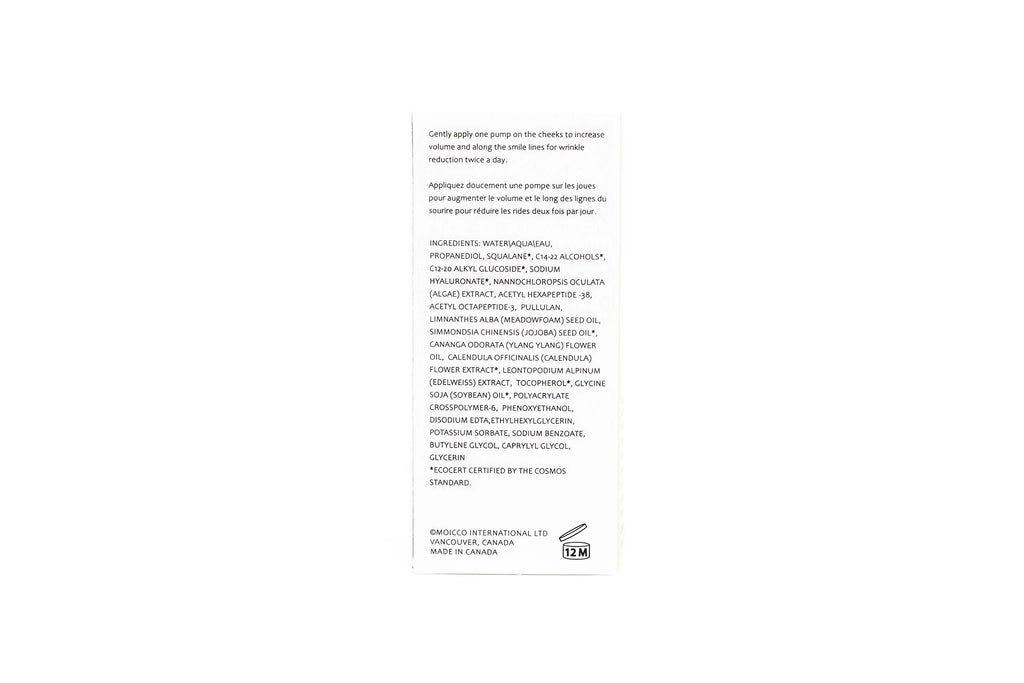 water\aqua\eau,propanediol,squalane*, c14-22 alcohols*, c12-20 alkyl glucoside*,sodium hyaluronate*, nannochloropsis oculata (algae) extract, acetyl hexapeptide -38, acetyl octapeptide-3, pullulan, limnanthes alba (meadowfoam) seed oil, simmondsia chinensis (jojoba) seed oil*, cananga odorata (ylang ylang) flower oil, calendula officinalis (calendula) flower extract*, leontopodium alpinum (edelweiss) extract, tocopherol*, glycine soja (soybean) oil*, polyacrylate crosspolymer-6, phenoxyethanol,disodium edta,ethylhexylglycerin, potassium sorbate, sodium benzoate, butylene glycol, caprylyl glycol, glycerin